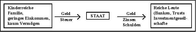 Wer kauft solche Anleihen? Natrlich nicht die kinderreichen Familien und armen Leute - die haben ohnehin kein Geld und brauchen jeden Pfennig selbst. Sondern: die reichen Leute; in der Realitt wird die groe Masse von Staatsanleihen heute fast ausschlielich von internationalen Banken, Trusts und Investmentgesellschaften gezeichnet - die ihrerseits wieder untereinander verbandelt sind.