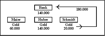 Herr Maier hat Herrn Schmidt insgesamt Gter und Dienstleistungen im Wert von DM 100.000 abgekauft, Herr Huber im Wert von DM 60.000,-. Das fhrt zu einer entsprechenden Verminderung des Geldes von Maier und Huber, und zu einer entsprechenden Erhhung des Geldes von Schmidt. Es kommt beim Kauf nur zu einer Verschiebung des Geldes - es wird aber kein Geld neu geschaffen, noch geht Geld aus dem Wirtschaftskreislauf verloren. Die gesamte Geldmenge der Volkswirtschaft betrgt weiterhin DM 400.000,-.