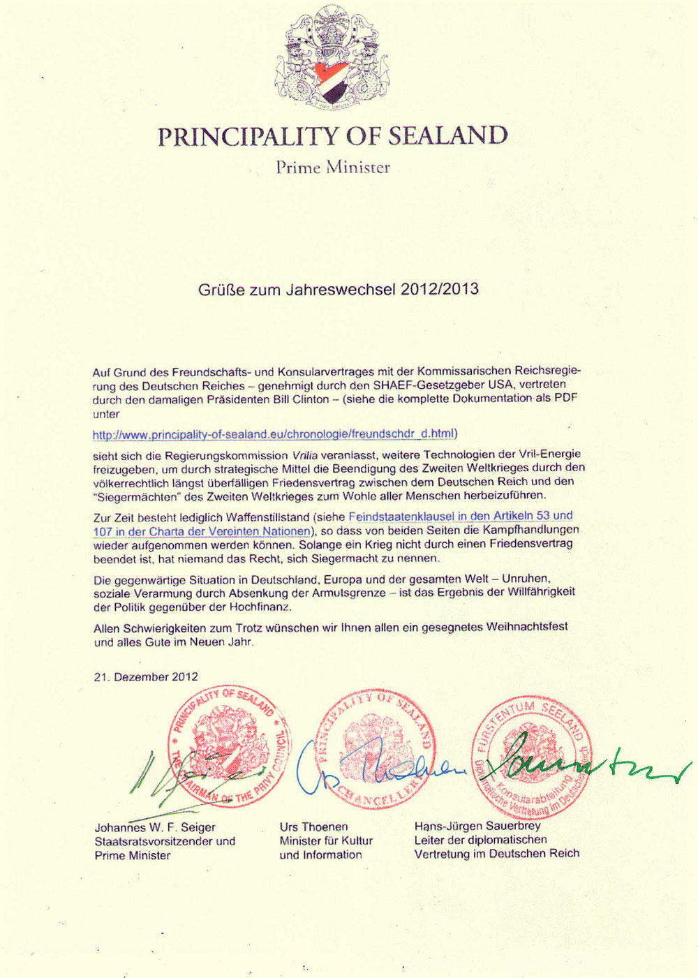 auf Grund des Freundschafts- und Konsularvertrages mit der Kommissarischen Reichsregierung, genehmigt durch den damaligen Präsidenten Bill Clinton, (www.principality-of-sealand.ch/hotstuff/shaef_201212.html ) bitten wir Sie um eine Überprüfung der rechtswidrigen Handlungen gegen die Principality of Sealand sowie gegen den Premierminister Johannes W. F. Seiger und seinen Mitarbeiterstab.