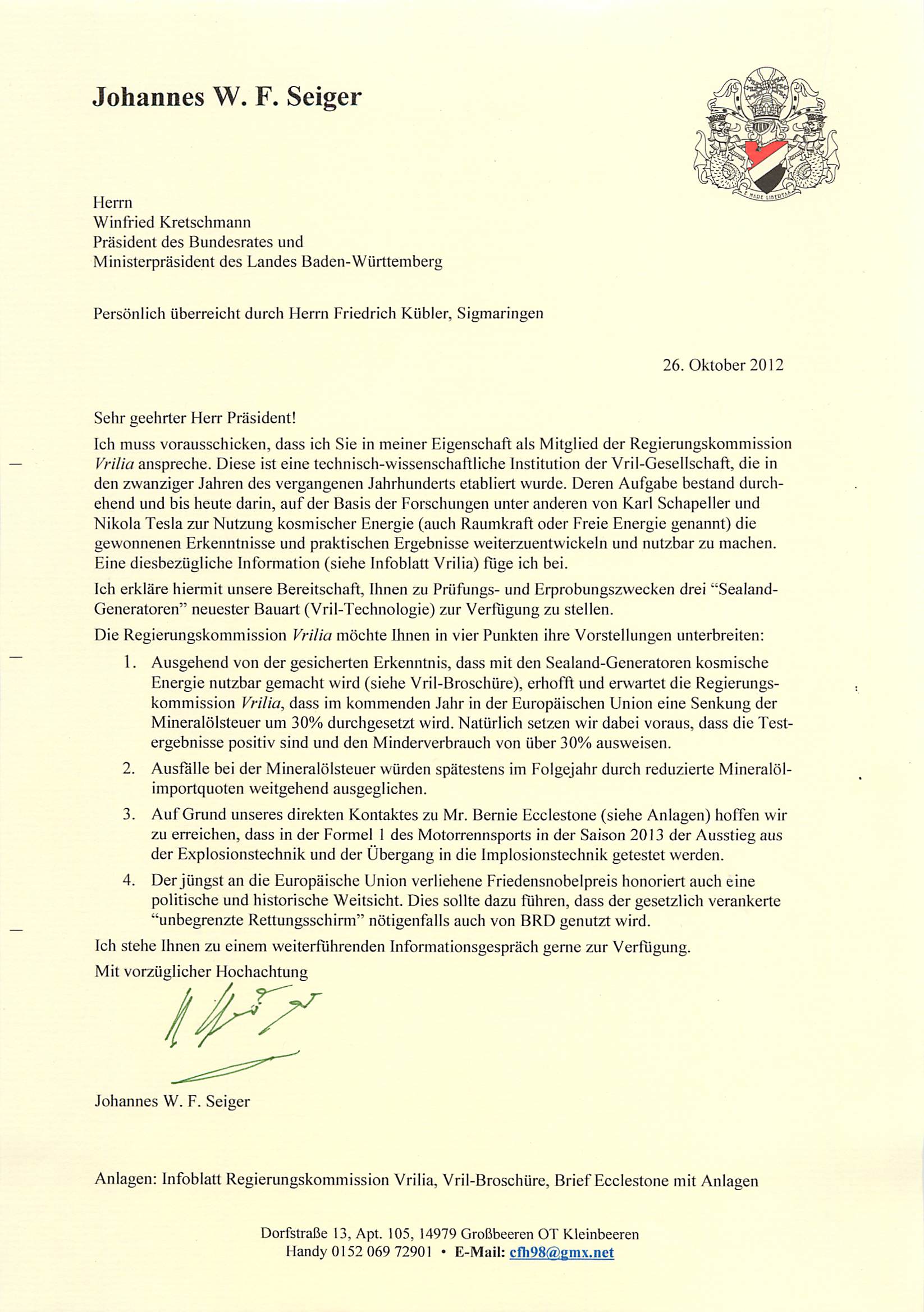 Ferner haben wir dem Ministerpräsidenten des Landes Baden-Württemberg und derzeitigem Bundesratspräsident, Herrn Winfried Kretschmann, mitgeteilt, dass der Sealand-Generator (Vril-Technologie) zur Lösung vieler der anstehenden Probleme beitragen wird. Unsere Aufforderung an Herrn Kretschmann kann offensichtlich auf Grund der geltenden Rechtslage in der Bundesrepublik Deutschland