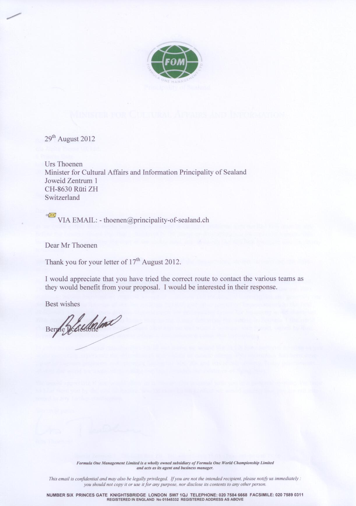 Wie Sie der Korrespondenz zwischen Mr Bernie Ecclestone und dem Minister für Kultur und Information der Principality of Sealand, Urs Thoenen (siehe die Anlagen dieser Pressemitteilung) entnehmen können, haben wir Mr Bernie Ecclestone dahingehend informiert, dass die gezielte Anwendung der Vril-Technologie den neuen Formel 1-Weltmeister schon vor Saisonbeginn bestimmen kann. Dem Wunsch von Mr Ecclestone entsprechend, werden wir zur Wahrung der Chancengleichheit in der Formel 1 den aktiven Teams den Sealand-Generator (Vril-Technologie) zugänglich machen.