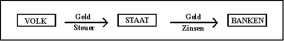 Indem der Staat so verpflichtet sei, fr aufgenommenes Geld Zinsen zu bezahlen, wie jeder andere auch, werde er gezwungen, verantwortungsbewut zu wirtschaften. Das Geld wird selbst zur Ware erhoben, fr die man zu bezahlen hat (Zinsen). Der Erfinder dieses Systems war brigens Kaynes - der mit "deficit spending" einen ungeahnten Wohlstand prophezeite.