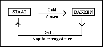 Sie alle mssen pltzlich einen Teil ihres hart erarbeiteten Geldes dem Staat abliefern; der Staat verwendet es seinerseits, um seine Zinsschuld bei den Banken zu begleichen. Und so finanziert und sichert ausgerechnet die Versteuerung des Zinsertrages die Ertrge aus Zinswirtschaft.