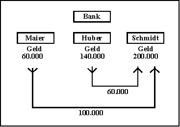 Herr Maier hat Herrn Schmidt insgesamt Gter und Dienstleistungen im Wert von DM 100.000 abgekauft, Herr Huber im Wert von DM 60.000,-. Das fhrt zu einer entsprechenden Verminderung des Geldes von Maier und Huber, und zu einer entsprechenden Erhhung des Geldes von Schmidt. Es kommt beim Kauf nur zu einer Verschiebung des Geldes - es wird aber kein Geld neu geschaffen, noch geht Geld aus dem Wirtschaftskreislauf verloren. Die gesamte Geldmenge der Volkswirtschaft betrgt weiterhin DM 400.000,-.