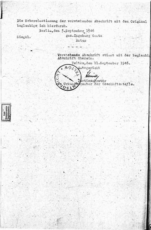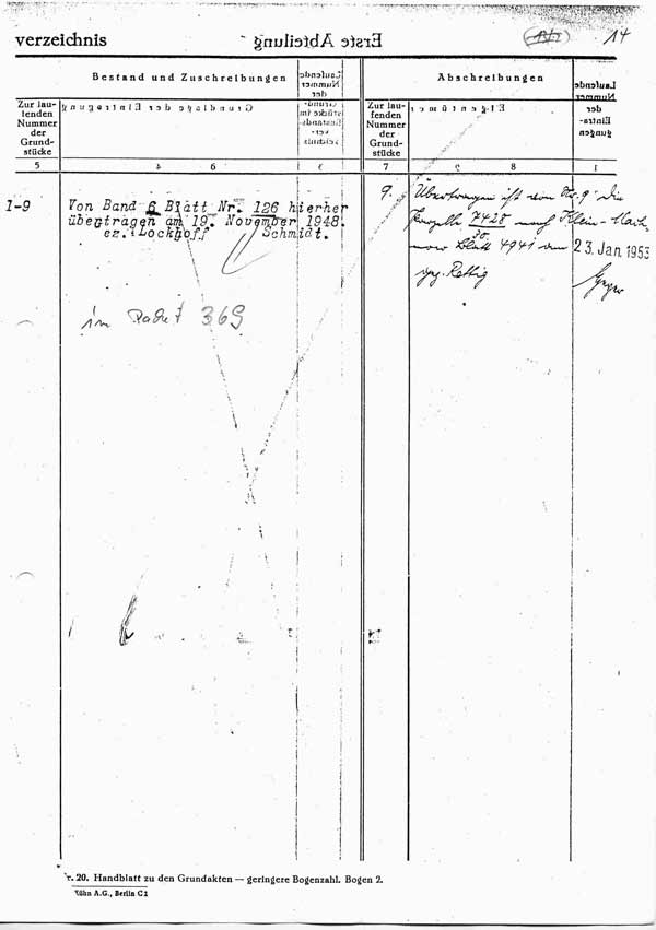 ‘Was transferred on page 126 to Public Property, according to the by-law of August 5, 1946 by the decisions passed by the Commission for Sequestration and Confiscation. On request by the Teltow District Council at Machnow from October 4, 1948, here entered on November 19, 1948. Signed Lockhoff Schmidt’