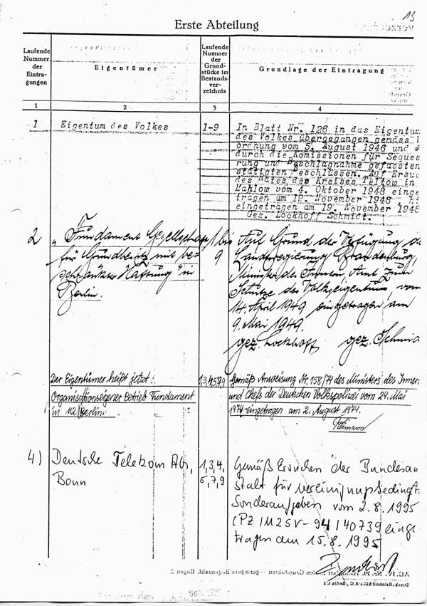 Entered here on May 9, 1949, based on the decision by the State Government Brandenburg, Minister of the Interior, Office for the Protection of Public Property, of April 14, 1949, owner ‘Fundament Gesellschaft für Grundbesitz mbH’, Berlin.