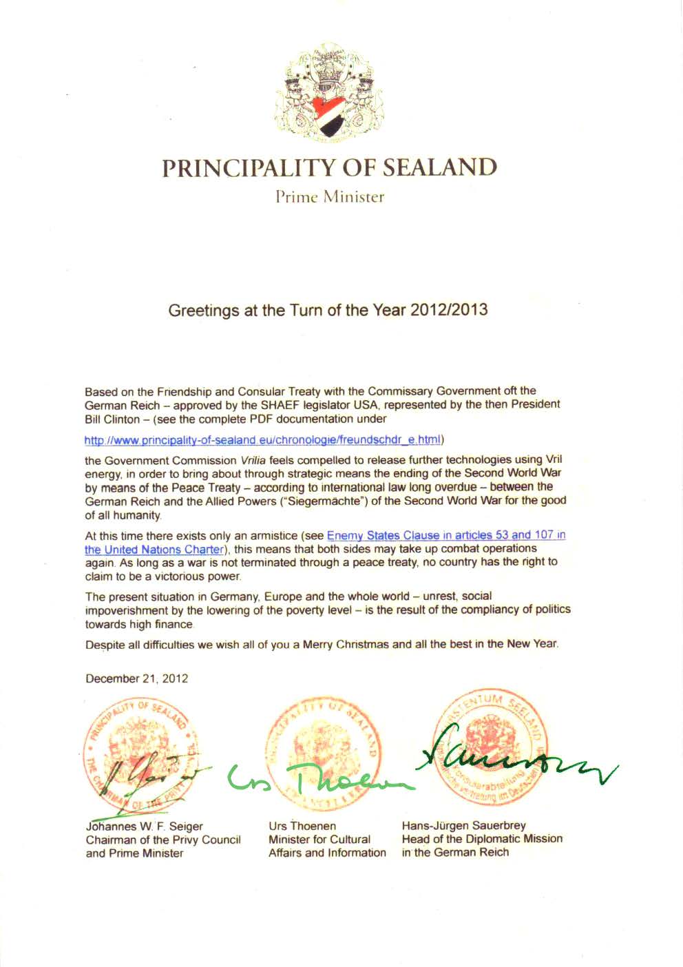 On September 17, 2012, the Prime Minister of Sealand, Johannes W. F. Seiger, wrote a letter to President Traian Basescu (forwarded via their Swiss Embassy), in which he offered to Romania the free use of the Vril technology the Principality of Sealand is providing.