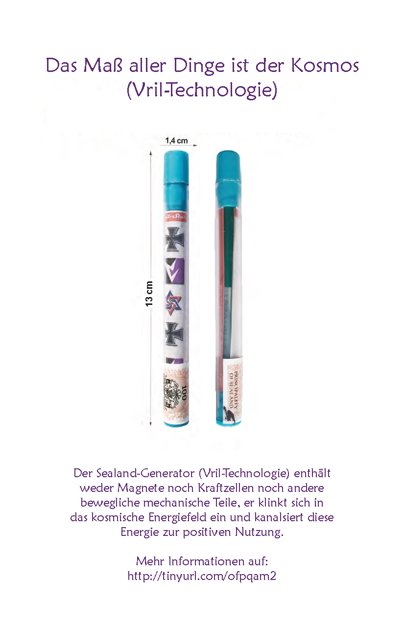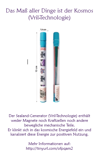 Der Sealand-Generator (Vril-Technologie) enthält weder Magnete noch Kraftzellen noch andere bewegliche mechanische Teile, er klinkt sich in das kosmische Energiefeld ein und kanalsiert diese Energie zur positiven Nutzung. Mehr Informationen auf: http://tinyurl.com/ofpqam2