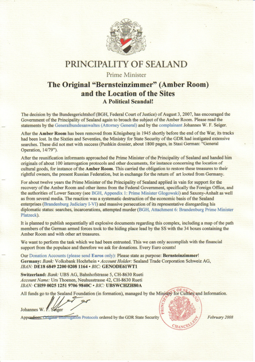 The decision by the Bundesgerichtshof (BGH, Federal Court of Justice) of August 3, 2007, has encouraged the Government of the Principality of Sealand again to broach the subject of the Amber Room. Please read the statements by the Generalbundesanwaltes (Attorney General) and by the complainant Johannes W. F. Seiger.