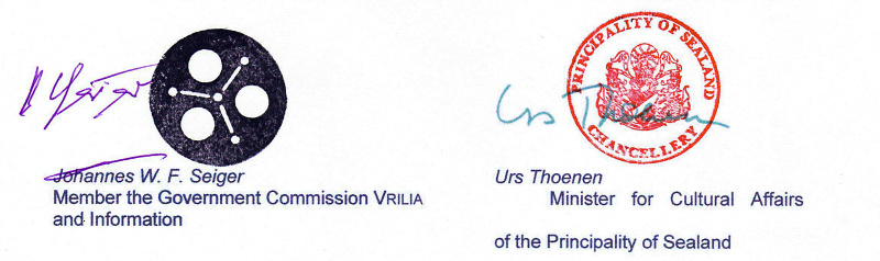 For more than 20 years the Government of the Principality of Sealand, represented by Johannes W. F. Seiger as member of the Government Commission Vrilia, has been encumbered, interfered with and restrained by the institutions of the German Federal Republic, above all by the land Brandenburg and its judiciary, using defamation as well as illicit verdicts and their execution. We see the cause for this in the fact that the Principality of Sealand had dared to mention the development and existence of the German flying disks (UFOs).