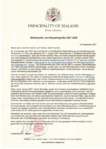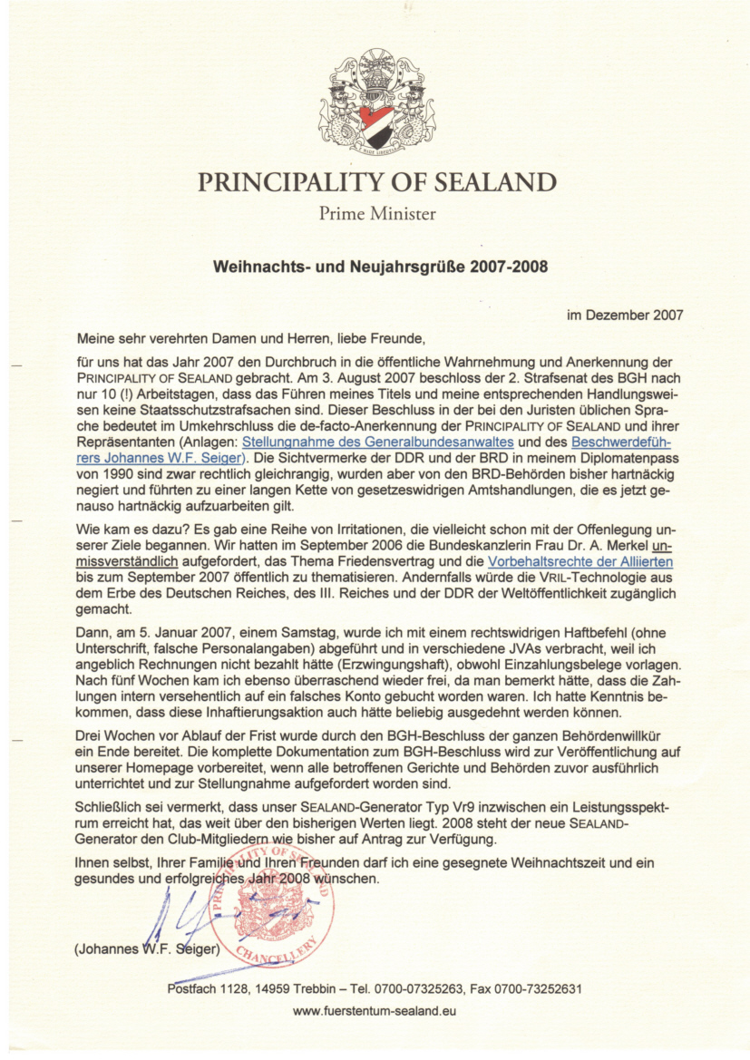 Meine sehr verehrten Damen und Herren, liebe Freunde, für uns hat das Jahr 2007 den Durchbruch in die öffentliche Wahrnehmung und Anerkennung der Principality of Sealand gebracht. Am 3. August 2007 beschloss der 2. Strafsenat des BGH nach nur 10 (!) Arbeitstagen, dass das Führen meines Titels und meine entsprechenden Handlungsweisen keine Staatsschutzstrafsachen sind. Dieser Beschluss in der bei den Juristen üblichen Sprache bedeutet im Umkehrschluss die de-facto-Anerkennung der Principality of Sealand und ihrer Repräsentanten (Anlagen: Stellungnahme des Generalbundesanwaltes und des Beschwerdeführers Johannes W.F. Seiger). Die Sichtvermerke der DDR und der BRD in meinem Diplomatenpass von 1990 sind zwar rechtlich gleichrangig, wurden aber von den BRD-Behörden bisher hartnäckig negiert und führten zu einer langen Kette von gesetzeswidrigen Amtshandlungen, die es jetzt genauso hartnäckig aufzuarbeiten gilt.