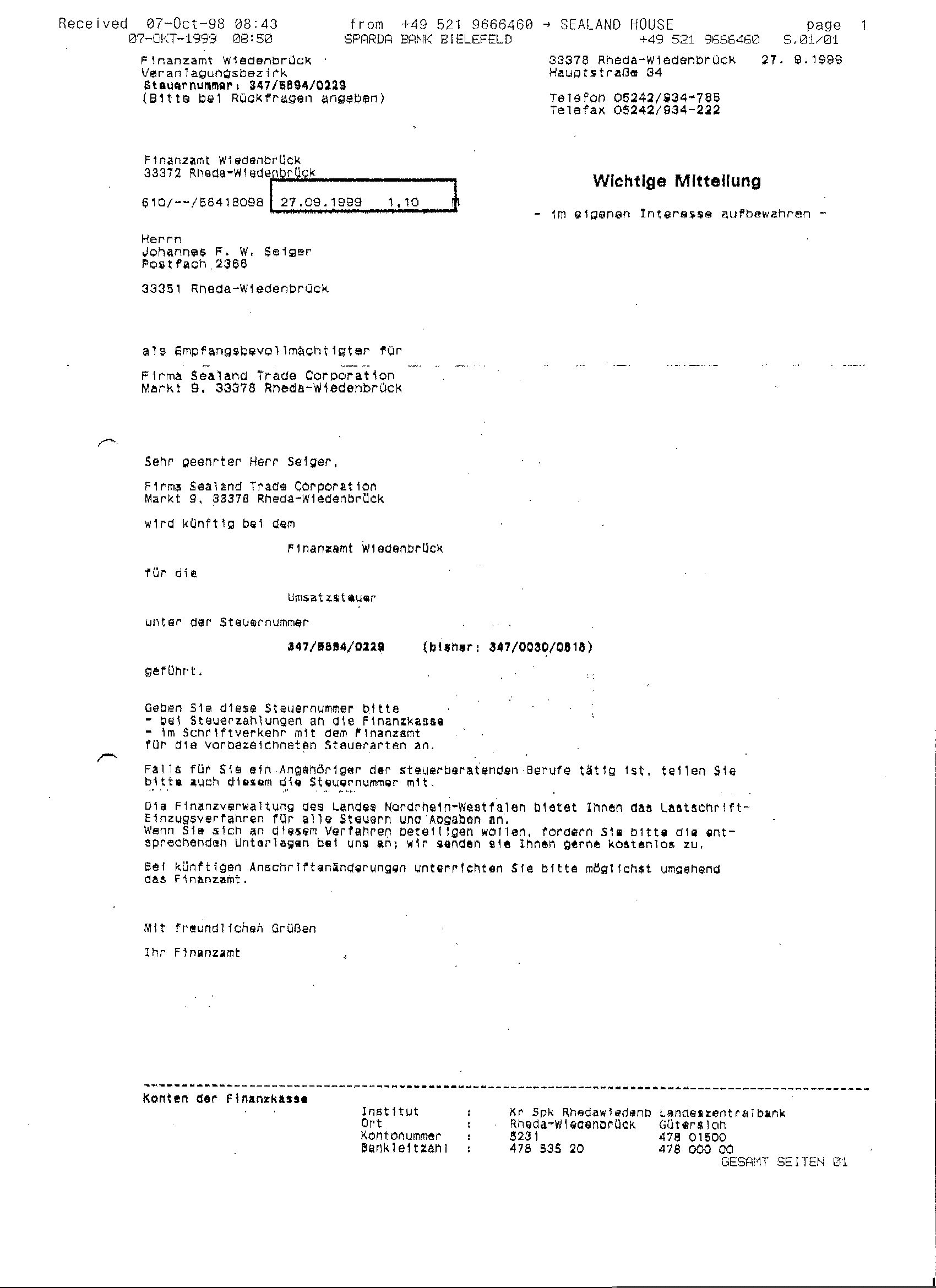 a) Der Sealand Trade Corporation wurde eine USt-Id.: DE 164906133 vom Bundesamt für Finanzen erteilt, ferner eine Umsatzsteuer Nr. 347/5894/0229 vom Finanzamt Rheda/Wiedenbrück sowie vom Hauptzollamt Bielefeld die Zoll-Nr. [ZNR]: 3723143.
