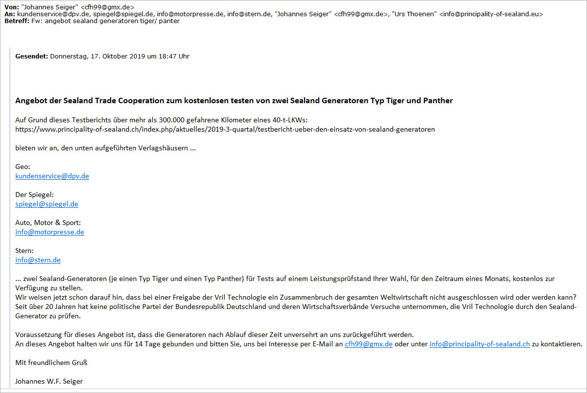 Angebot der Sealand Trade Cooperation zum kostenlosen testen von zwei Sealand Generatoren Typ Tiger und Panther