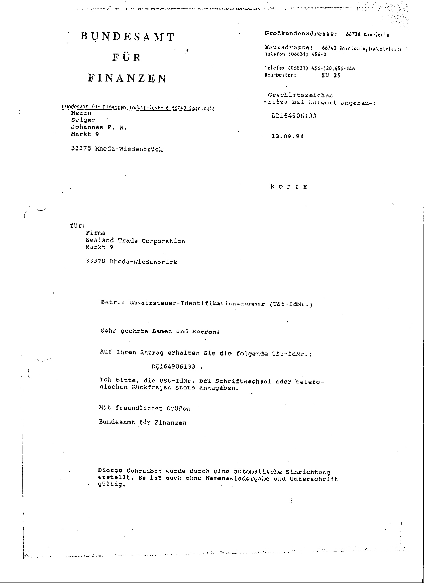 a) Der Sealand Trade Corporation wurde eine USt-Id.: DE 164906133 vom Bundesamt für Finanzen erteilt, ferner eine Umsatzsteuer Nr. 347/5894/0229 vom Finanzamt Rheda/Wiedenbrück sowie vom Hauptzollamt Bielefeld die Zoll-Nr. [ZNR]: 3723143.