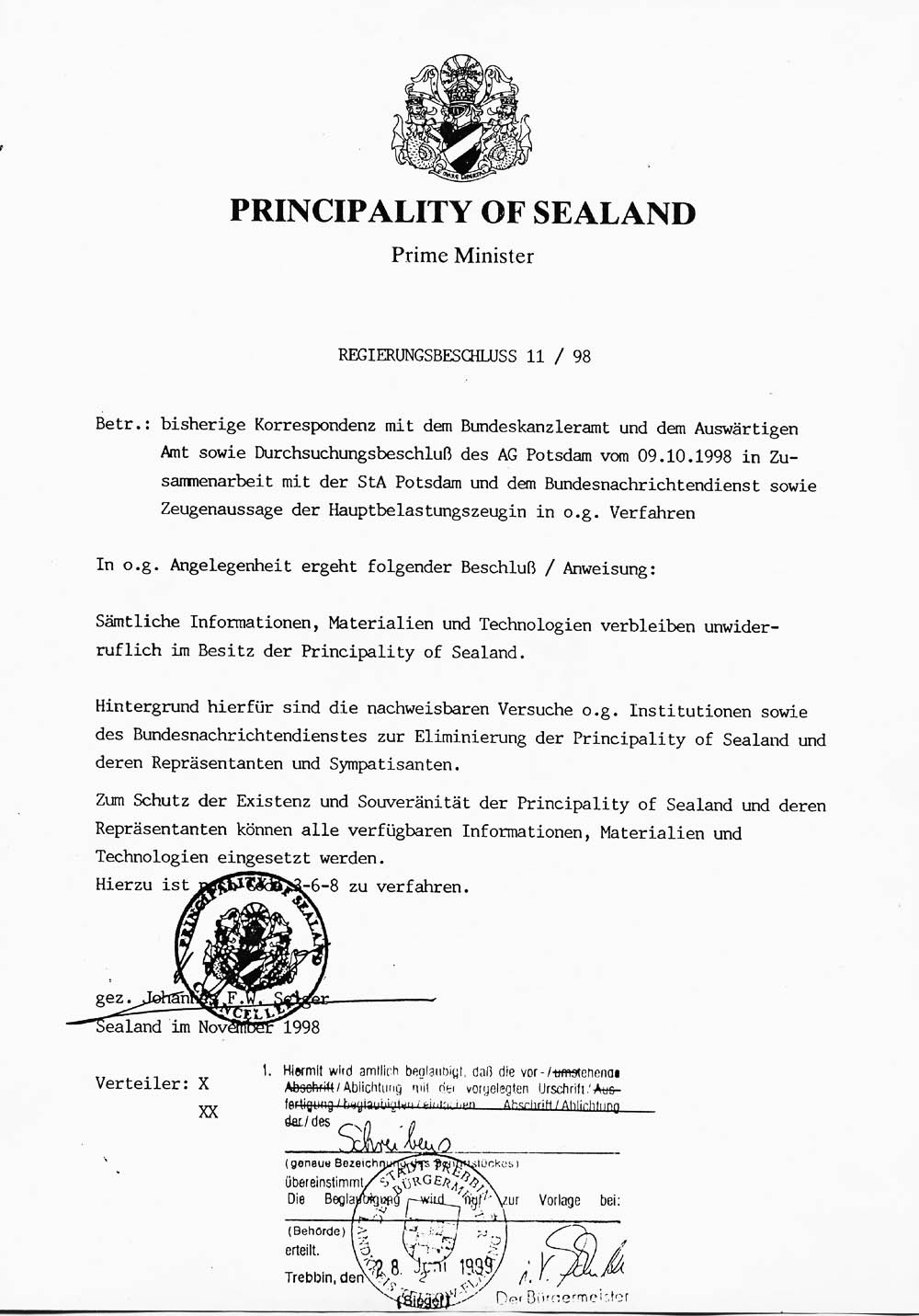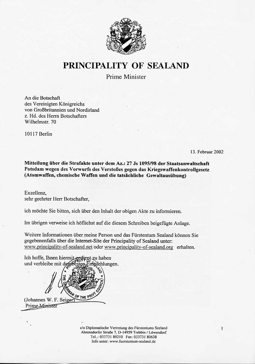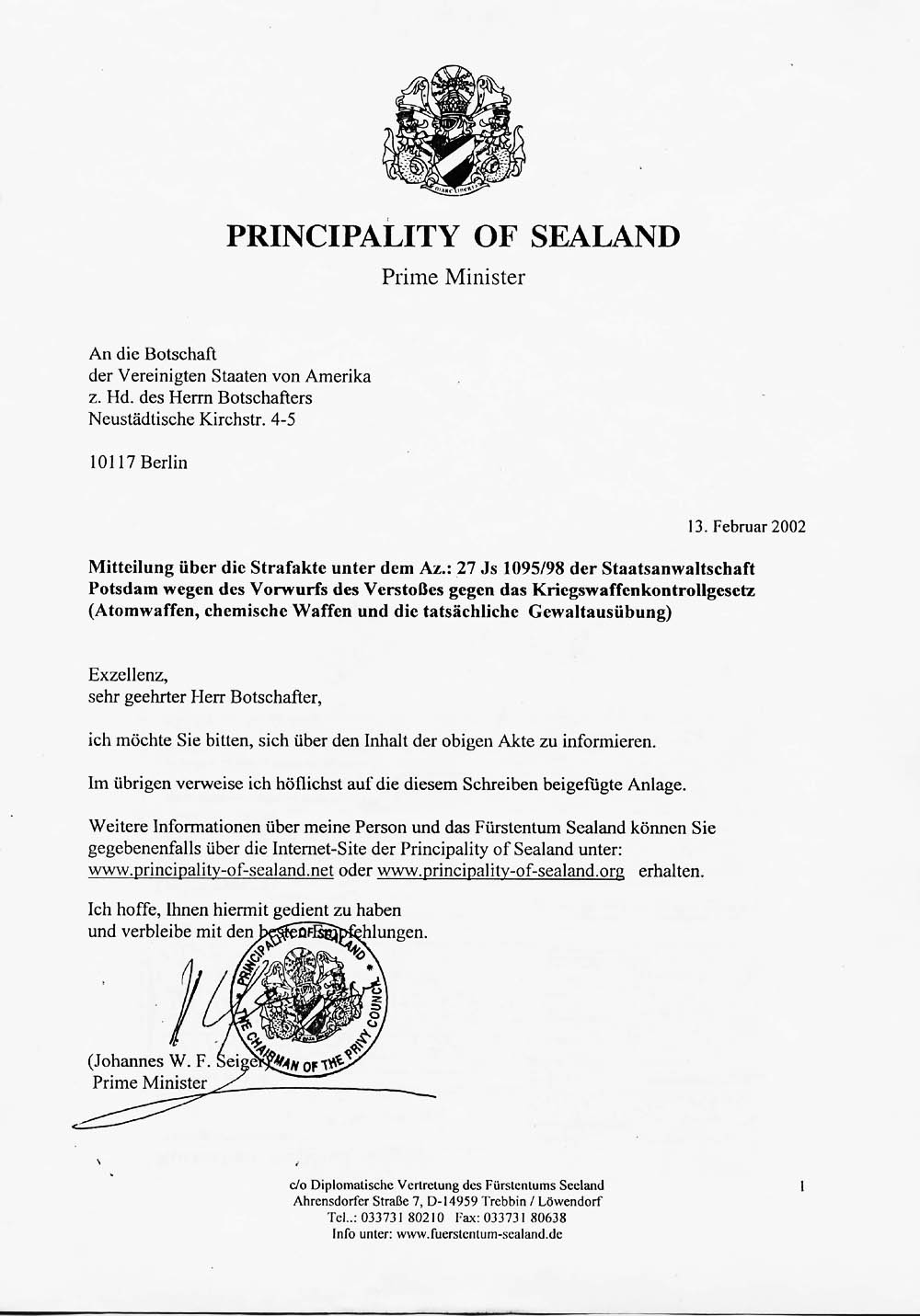 Presseerklärung über die Strafakte unter dem AZ.: 27JS 1095/98 der Staatsanwaltschaft Potsdam wegen des Verstoßes gegen das Kriegswaffenkontrollgesetz (Atomwaffen, chemische Waffen und tatsächliche Gewaltausübung) mit den obigen vier Schreiben und der Regierungserklärung 11-98 sowie dem Kanzlerbrief vom 14. 1. 2000 in einer pdf-Datei dasselbe als zip-Datei