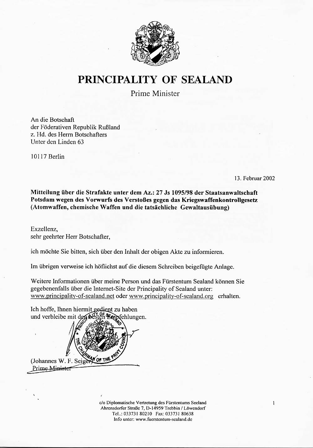 Herausgeber: Diplomatische Vertretung des Fürstentums Sealand im Deutschen Reich Postadresse: c/o Sealand House Postfach 2366 D - 33351 Rheda-Wiedenbrück Email: Diese E-Mail-Adresse ist vor Spambots geschützt! Zur Anzeige muss JavaScript eingeschaltet sein! Telefon: +41-55-240 71 05 Telefax: +41 (0) 55 240 71 06 Hans Jürgen Sauerbrey, Regierungsmitglied